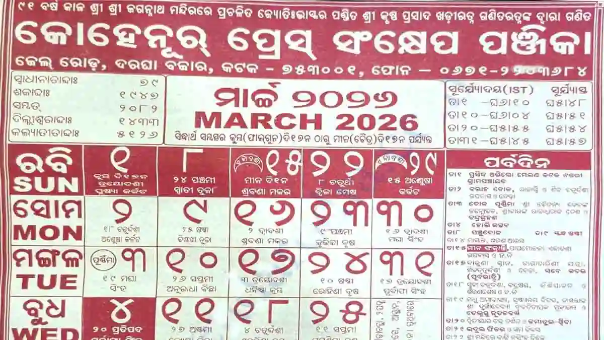 The Odia Calendar 2026 March is an important reference for people in Odisha and Odia communities worldwide. It provides details about tithi (lunar day), nakshatra, Hindu festivals, fasting days and sunrise–sunset timings according to the traditional Odia Panchang.
